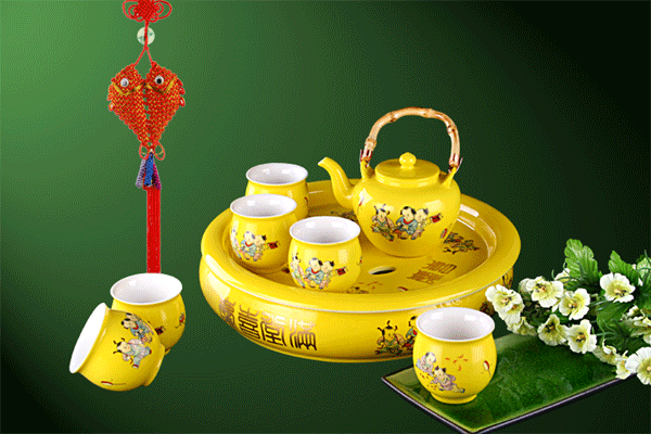 | 產(chǎn)品名稱:帝王黃五福童子茶壽如意壺杯組 |