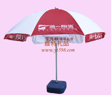 傘架材質(zhì):48寸(1寸為2.54CM)*8防風(fēng)架,主線為4.3線; 傘布:210D牛津加密布 (傘面布的顏色可以根據(jù)客戶要求選擇二種色搭配,顏色:常有紅、藍、黃、綠、橙、黑、白等鮮艷色彩); 打樣時間為:7天; 100把起訂,四版單色印字, 傘座有五款(基本顏色為紅、黃、藍、綠四種,量大也可以根據(jù)客戶的需求調(diào)整顏色)具體如下: