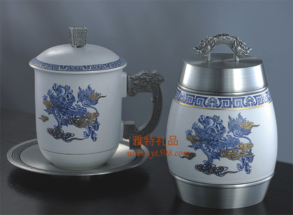 | 產(chǎn)品名稱(chēng):純錫釉點(diǎn)青花瓷茶杯茶葉罐二件套 |