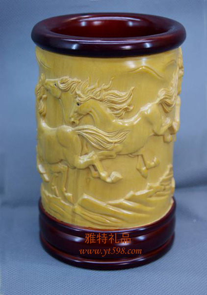| 產(chǎn)品名稱:大葉黃楊木浮雕八駿圖筆筒 |